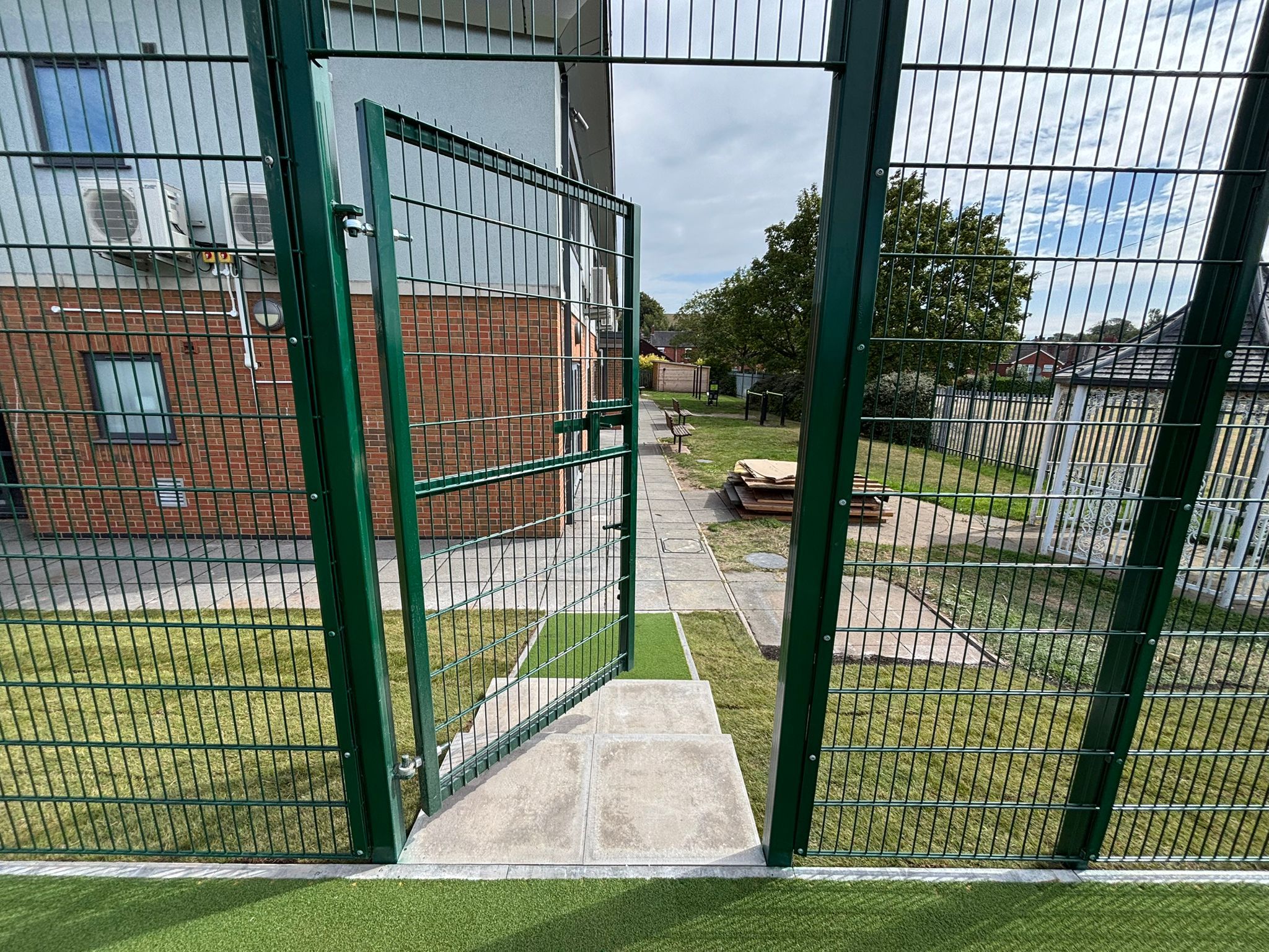 • A bespoke fencing design with built-in basketball hoops and recessed football goals.